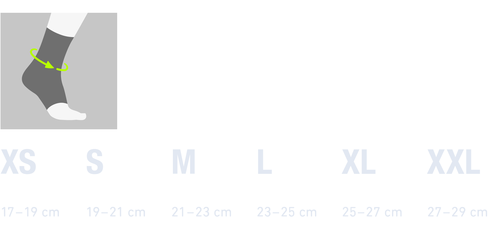 The Sports Ankle Support holds the ankle securely in place during longer sporting activities and protects against painful sprains. The support’s beneficial compression and integrated taping strap stabilise the ankle. It is wound around the foot in a figure-of-eight configuration and tightened if needed. It lasts longer than conventional sport taping. The knitted fabric gently massages the tissue during movement. The looped strap also exerts additional compression. This action stimulates circulation and the metabolism. This dual stimulation triggers positive sensorimotor feedback: The ligaments are relieved and the stabilising muscles are activated more quickly, thus improving joint coordination in the long term. The support provides effective protection against lateral twisting. Overloading pain subsides more quickly and the adoption of relief postures is prevented. The knitted fabric of the Sports Ankle Support is similar to a fine net made of an airy mesh and consists of a breathable, hard-wearing material. This makes the support especially lightweight, comfortable to wear, and practical for sports. Its anatomic contouring and taping strap guarantee a secure fit and maximum freedom of movement.