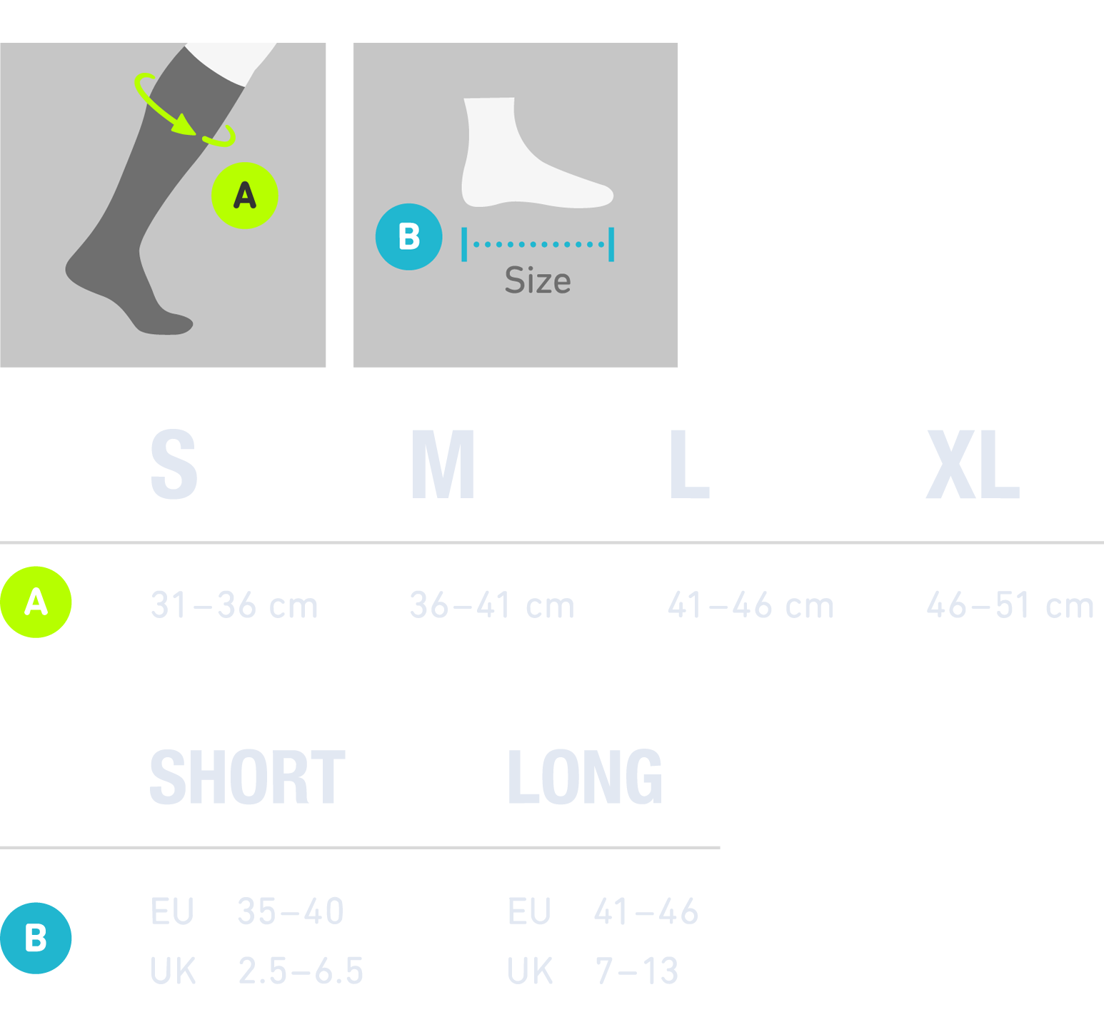 A) Measure the circumference of your calf at the largest point. B) Use your standard shoe size to determine the length of your socks.
