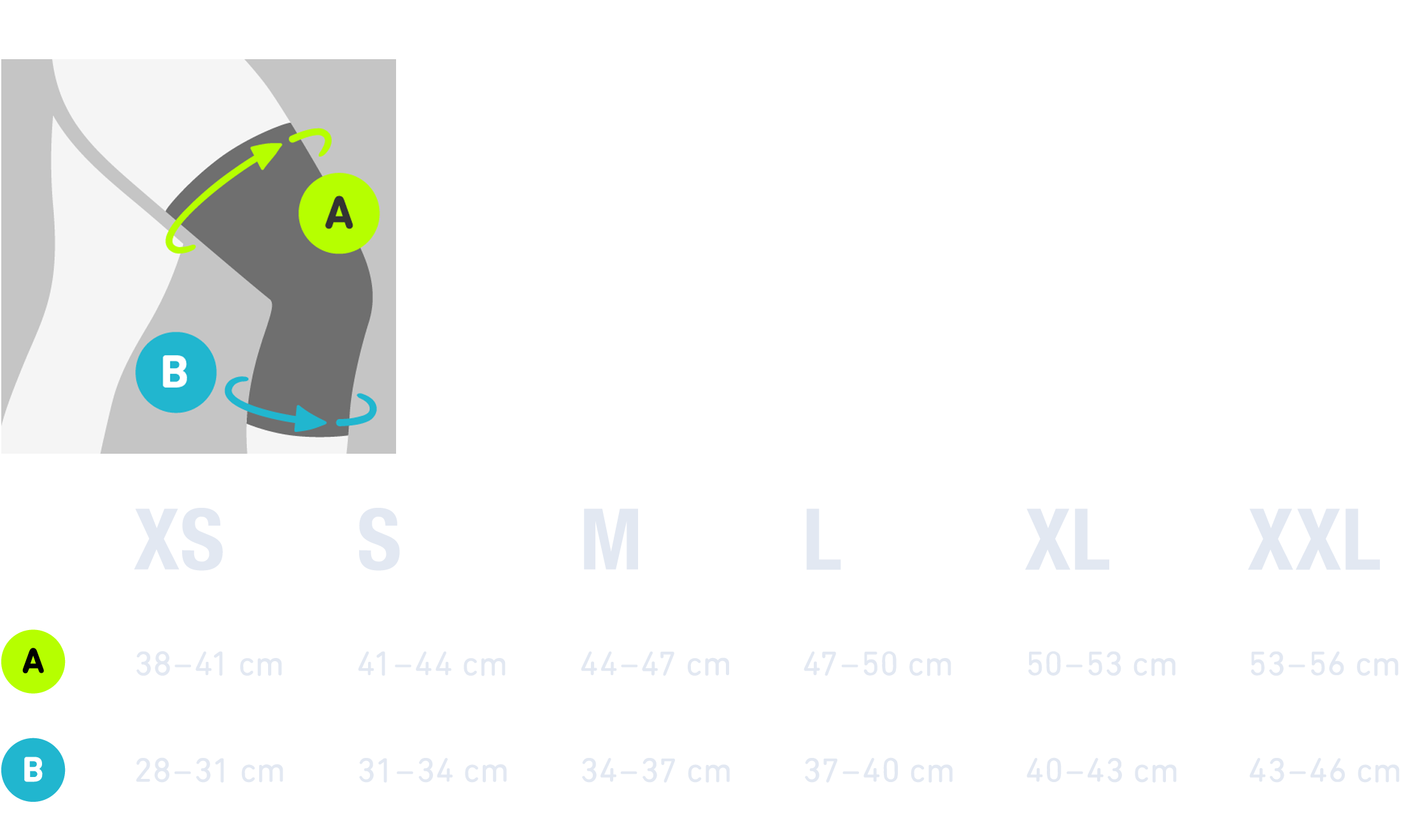Bend your knees slightly. Determine the center of the knee cap and extend to the side of your knee as a starting point. Measure the circumference 14 cm above this point towards your upper body (A) and 12 cm below it towards your feet (B).